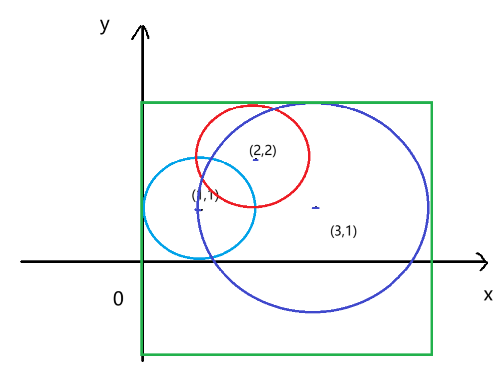 然后有 n 行数据,每行数据有 x,y,r 分别表示该圆的圆心整数坐标 ( x,y )与整数半径 r。