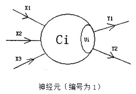 图中,X1—X3是信息输入渠道,Y1—Y2是信息输出渠道,C1表示神经元目前的状态,Ui是阈值,可视为神经元的一个内在参数。