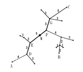 下面的图给出了树网的一个实例。图中,A-B与A-C是两条直径,长度均为20。点W是树网的中心,EF边的长度为5。如果指定s=11,则树网的核为路径DEFG(也可以取为路径DEF),偏心距为8。如果指定s=0(或s=1、s=2),则树网的核为结点F,偏心距为12。