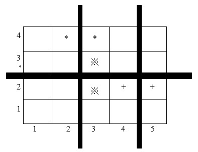 上图中用符号*、※、+标出了3对会交头接耳的学生的位置,图中3条粗线的位置表示通道,图示的通道划分方案是唯一的最佳方案。