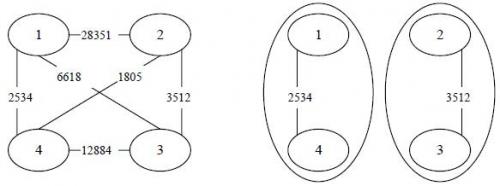 罪犯之间的怨气值如下面左图所示,右图所示为罪犯的分配方法,市长看到的冲突事件影响力是3512(由2号和3号罪犯引发)。其他任何分法都不会比这个分法更优。