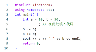 13.在下列代码的横线处填写(),使得输出是`50 10`。