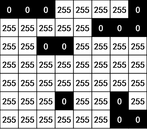 一张黑白照片高度是m个像素,宽度是n个像素。我们可以用二维数组描述这个m*n的像素点阵。下面的例图是一个7*8的像素点阵,并标记了像素值。