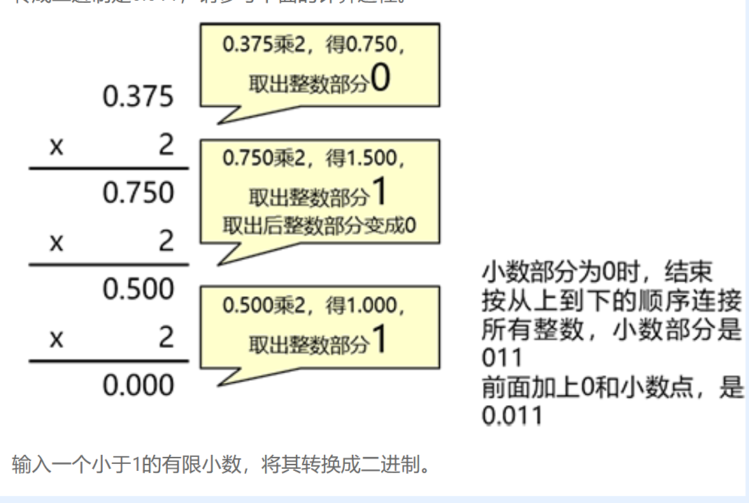 小数部分“乘2取整”,直到小数部分为0,然后顺序输出所有整数。例如,将0.375转成二进制是0.011,请参考下面的计算过程。